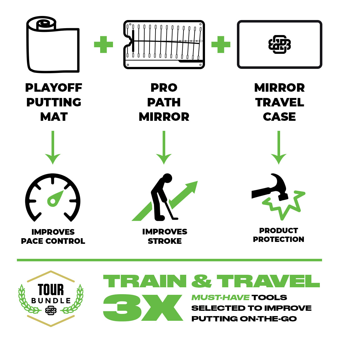 The Pro Path Putting Mirror and Play-Off Putting Mat work together to refine your stroke mechanics, posture, and control. Perfect your setup, develop a repeatable putting path, and lower your scores faster.
